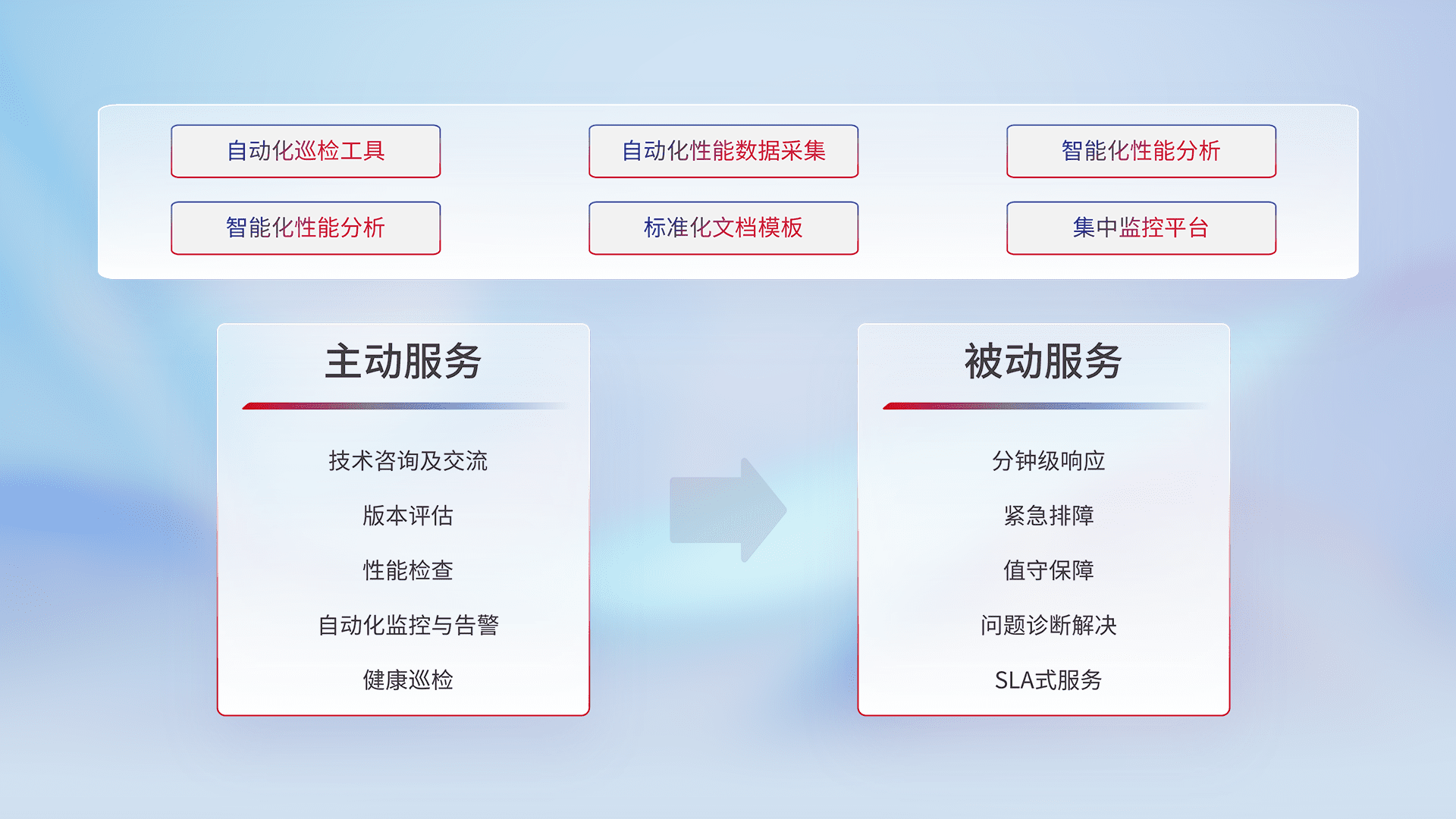 智能化工具和标准化文档,,,保障服务质量,,,,提供主动服务(包含技术咨询、、、、版本评估、、、性能检查、、、自动化监控与告警、、、、健康巡检)和被动服务包含(分钟级响应、、、、紧急排障、、值守保障、、、问题诊断解决、、SLA服务)。。。