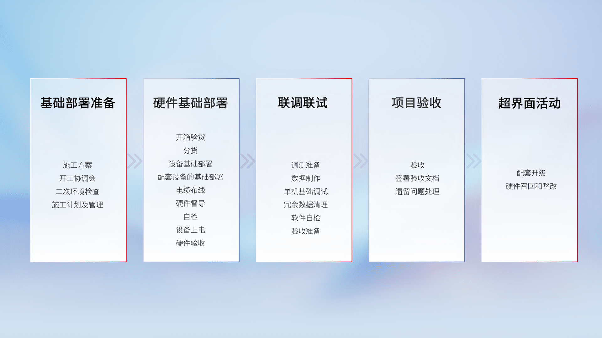 从基础部署准备、、、硬件基础部署、、联调联试、、、项目验收、、、、越界面活动的全过程可追溯,,,保证施工质量和进度。。